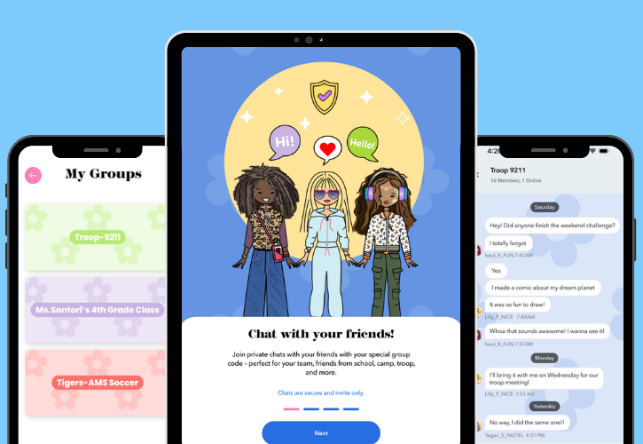 Create private groups for friends, sports teams, classmates, or summer camp buddies, all moderated for safety and positivity with built-in time limits. We want her to build healthy digital habits early so that means the group chat shuts off in the evening and doesn’t turn back on until the next morning.